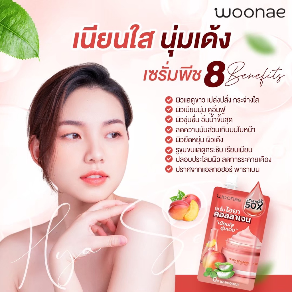 Woonae วูเน่ พีช คอลลาเจน ไฮยา9X พาวเวอร์ เซรั่ม 50กรัม (1กล่อง 6ซอง)
