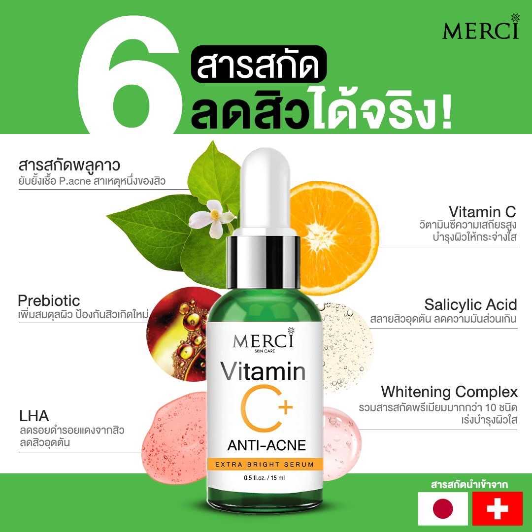 MERCI เซรั่มสูตรลดปัญหาสิว Merci VITAMIN C+ ANTI-ACNE EXTRA BRIGHT SERUM 15 ml.