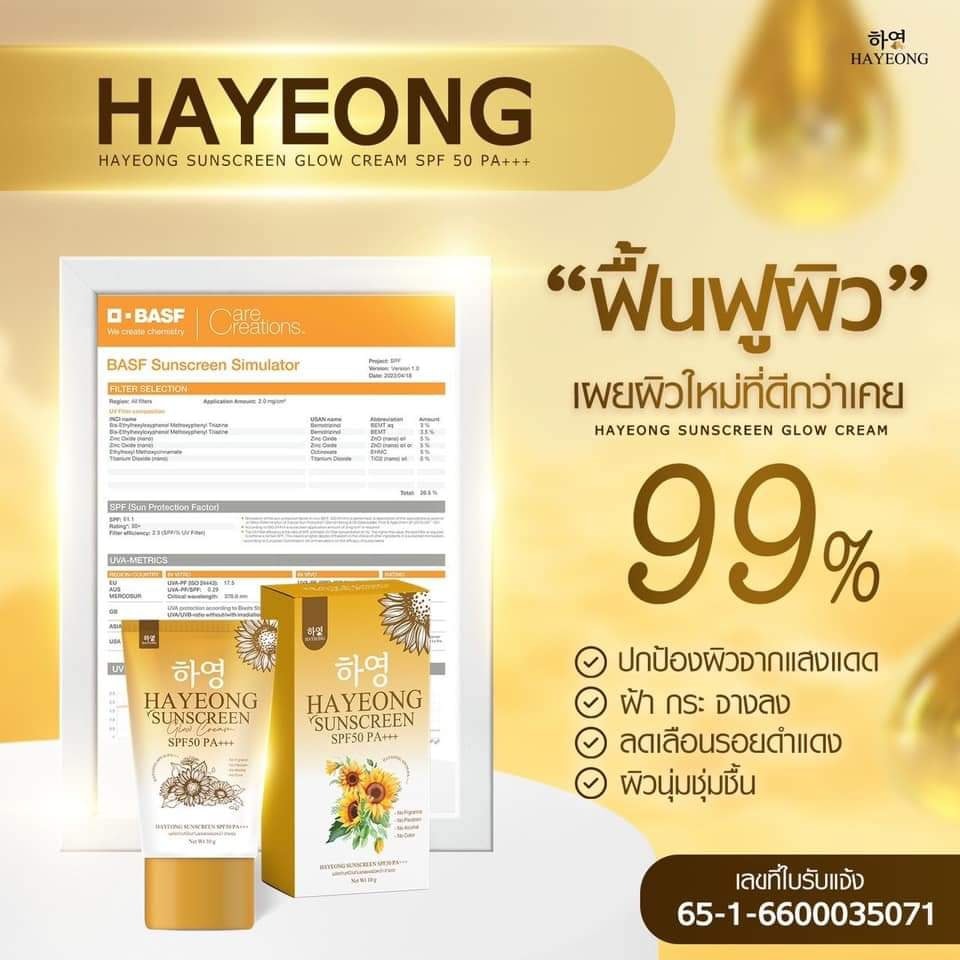 Hayeon Sunscreen SPF 50PA+++ ครีมกันแดดนวัตกรรมใหม่ บางเบา ซึมซาบเร็ว แห้งสบายผิว มี blurring effect เพิ่มความเรียบเนียนหลังทาทันที ไม่อุดตันผิว ช่วยเพิ่มความเสถียรในการปกป้องผิวจากแสงแดดได้ยาวนานถึง 16 ชม. ด้วย SPF50 PA+++ ปกป้องผิวจากแสงแดด รังสี UVA UVB ผสานสารสกัดอันทรงคุณค่าจากธรรมชาติ ที่ช่วยปกป้องผิวจากเชื้อแบคทีเรีย ควบคุมความมัน ปกป้องผิวจากการระคายเคือง มลภาวะ